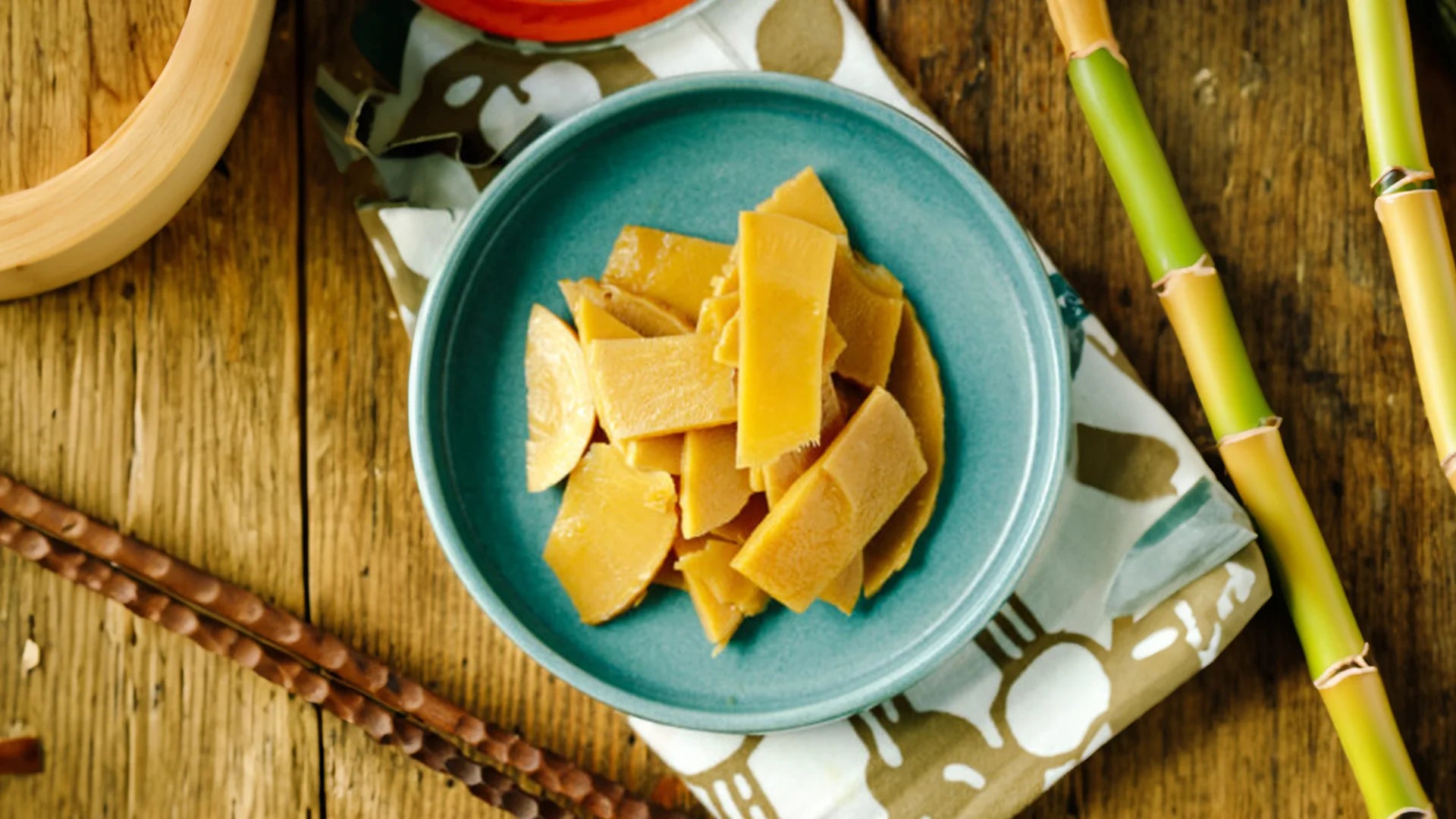 Bambusskudd bevart i lake, perfekte for å løfte dine asiatiske retter. Disse skuddene er møre...